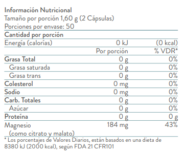 Es un suplemento formulado para ofrecer los beneficios del magnesio, cada porción de 2 cápsulas proporciona 184mg de magnesio en forma de citrato y malato de magnesio. Esta combinación ayuda a la absorción proporcionando beneficios a la salud muscular, nerviosa y ósea. Cada ingrediente en el Magnesio Complex pasa por rigurosos controles de calidad.